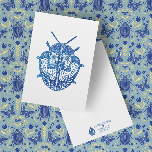 🪲 Une carte pour écrire des petits mots au dos. C'est la reproduction numérique d'une de mes linogravures originales. Celle-ci représente un insecte fleuri : un scarabée tout rond avec une carapace pleine de fleurs 🪲