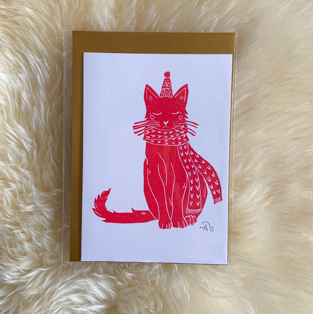 Une gravure d'un chat portant une écharpe sur une carte de Noël. Cette petite gravure peut aussi être encadrée. Elle est vendue avec une jolie enveloppe dorée. ✨