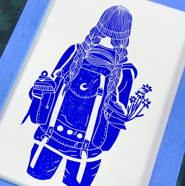 🌿 Une linogravure originale d’une jeune femme qui porte un gros sac à dos de randonnée. Elle doit revenir d'un bivouac en montagne car elle porte un bonnet sur ses cheveux tressés. 🌿