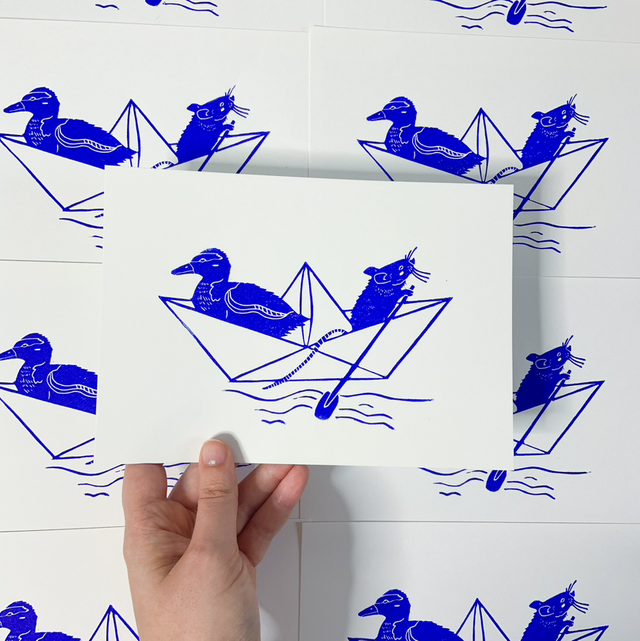 🌿 Une linogravure originale de deux copaines sur un bateau en papier : un caneton et une souris. Ils voguent pour partir découvrir le monde et voir l'océan.🌿