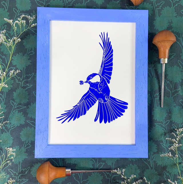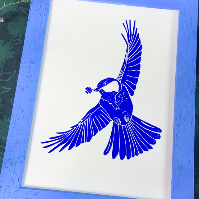 🍀 Une linogravure originale d'une mĂ©sange en plein vol qui tient dans son bec un trĂšfle Ă  4 feuilles 🍀
