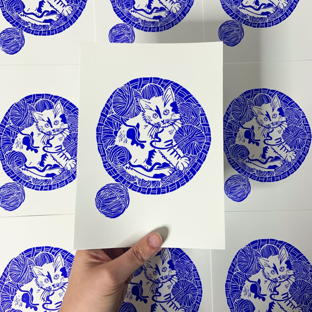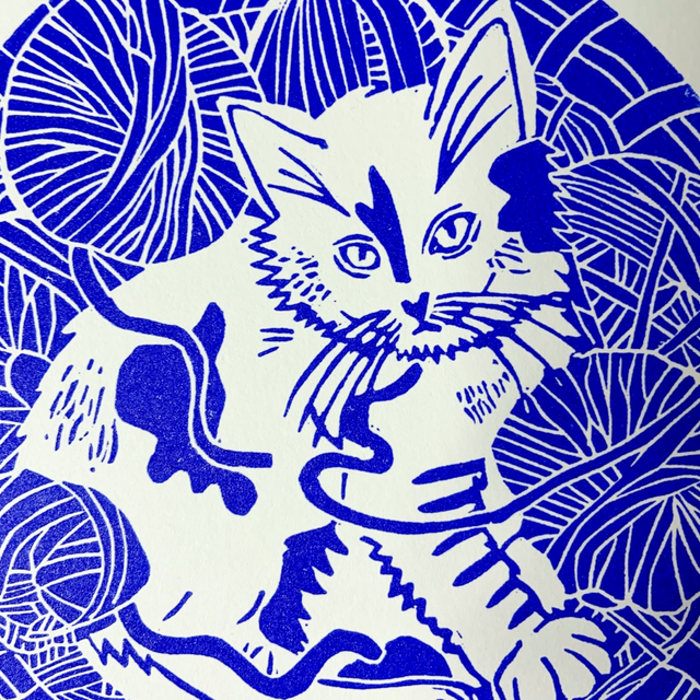🐱 Une linogravure originale d'un chaton caché dans une panière remplie de pelotes de laine. Une gravure pour les fans de tricot. 🐱