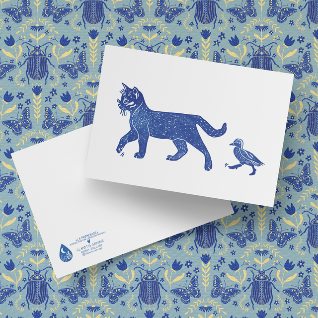 🌿 Une carte pour écrire des petits mots au dos. C'est la reproduction numérique d'une de mes linogravures originales réalisées pour Inktober 2023. Celle-ci représente un chaton et un canard qui partent en randonnée. 🌿