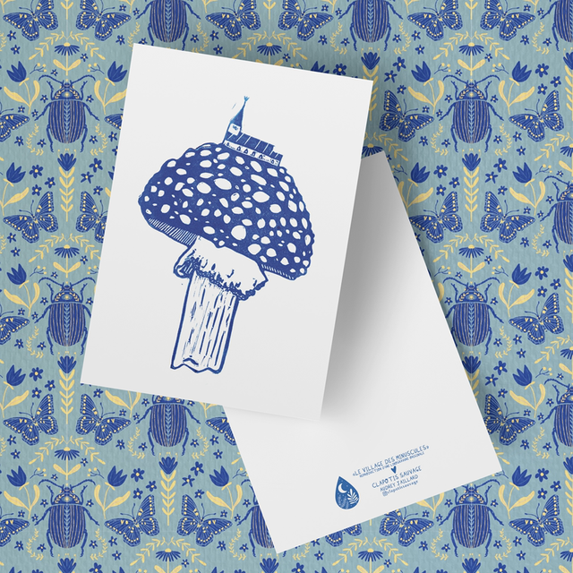 🍄 Une carte pour écrire des petits mots au dos. C'est la reproduction numérique d'une de mes linogravures originales réalisées pour Inktober 2023. Celle-ci représente le village des minuscules avec son cloché perché sur un champignon. 🍄