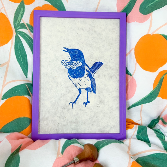 Linogravure "La pie en smocking". La pie qui aime ce qui brille a sorti son habit de lumière ! ✨